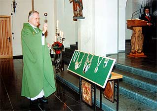Zunächst zogen die Schützen nach dem Antreten am Café Theisen zum Gottesdienst in die Gemünder Pfarrkirche. Pfarrer Rolf Knips, der gleichzeitig Präses der Bruderschaft ist, segnete im Rahmen der Messfeier die Ketten der Majestäten ein und wünschte den Majestäten alles Gute für ihr bevorstehendes Ehrenjahr.
