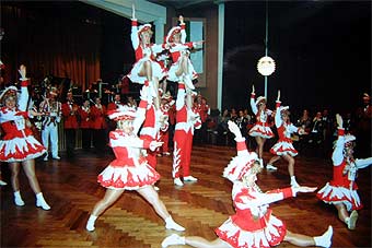 Traditionsgemäß stattete auch die Gemünder Karnevalsgesellschaft Rot-Weiß" den Grünröcken einen Besuch ab. Prinz Hermann I. und Prinzessin Heike wurden dabei von zahlreichen Akteuren begleitet, die es sich nicht nehmen ließen, flotte Gardetänze vorzuführen.