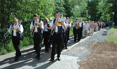 | Der Musikverein Waldorf bereicherte das Fest. Pfarrer Rolf Knips geizte nicht mit Weihwasser und segnete das neue Gebäude von außen und innen ein. | ||||||||||||||
