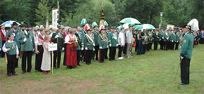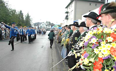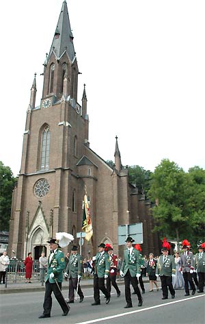 Nach dem traditionellen Erbsensuppenessen fand am Nachmittag der große Festumzug mit befreundeten Schützenbruderschaften durch gemünd statt. Daran nahmen knapp 700 Schützen teil. Unter anderem waren im Festzug der Dedenborner Diözesanbundesmeister Kurt Bongard, der Nettersheimer Bezirkspräses Gerd-Heinrich Mitzscherling, der Ehrenvorsitzende Horst Freimark und Ehrenbundesmeister Joachim Hermann zu sehen. |
