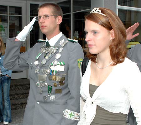 Jungschützenprinz Jörg Heinen und Carolin Kammers beim Vorbeimarsch vor dem Kirchgang. Rechts zu sehen die von Oberst Ludwig Cremer angeführten Schützen auf dem Weg zum Festplatz.