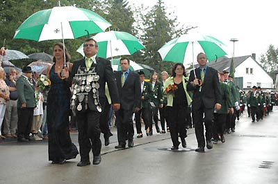 | Bezirksschülerprinz Sven Goebgen (li.) sowie befreundete Schützenbruderschaften beim Vorbeimarsch im Regen (re.). |