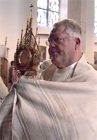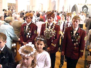 Anstelle der Prozession durch den Ort zog Knips mit der Monstranz durch das Mittelschiff der Pfarrkirche und wurde dabei von den Kommunionkindern sowie den Majestäten der Gemünder Schützenbruderschaft begleitet.