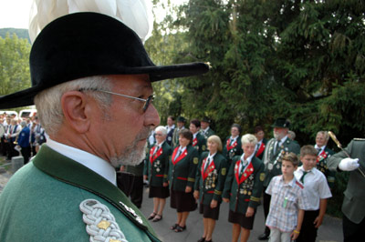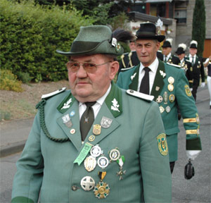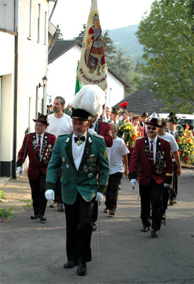Gerhard Remus und Ernst Kühn im Festumzug (li.), die Ehrengäste Bürgermeister Ralf Hergarten, Pfarrer Rolf Knips und Diözesanbundesmeister Kurt Bongard (Mitte).