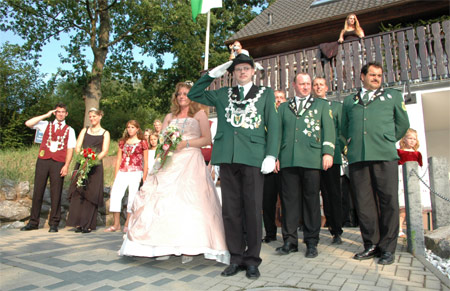 König Ernst Mauel empfing die Schützen an seinem Wohnhaus in Nierfeld, bevor man den ersten Vorbeimarsch am Regiment zelebrierte.