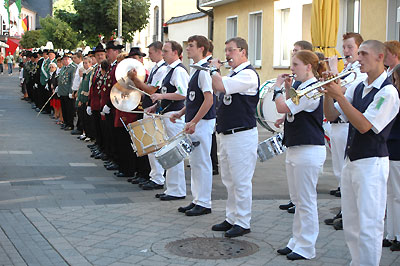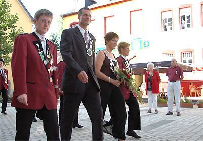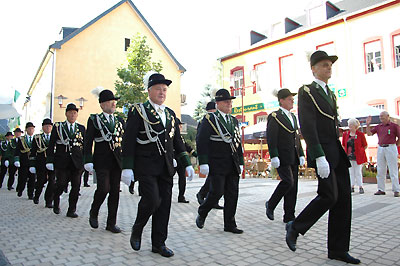 Das Gemünder Königspaar mit Königin Anita Knie und Prinzgemahl Werner, die Andreas-Kompanie im 50-jährigen Jubiläumsjahr sowie die Schützen der St- Rochus-Kompanie mit Gästen vom Hubertuszug aus Mönchengladbach-Hardt.