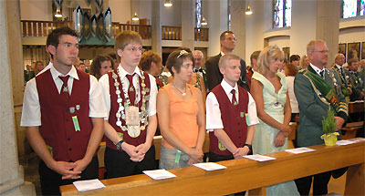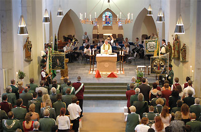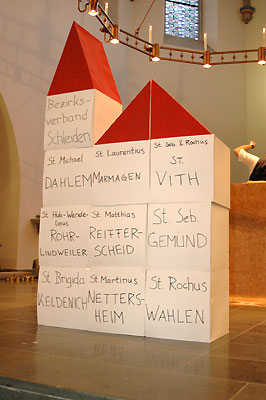 Den Gottesdienst anlässlich des Bezirksfestes zelebrierte Präses Rolf Knips in der Pfarrkirche St. Nikolaus. Symbolisch wurde die Verbundenheit der Bruderschaften durch den Bau einer Kirche aus einzelnen Elementen dargestellt. An der Messe nahmen auch die amtierenden Majestäten des Bezirksverbandes Schleiden teil.
