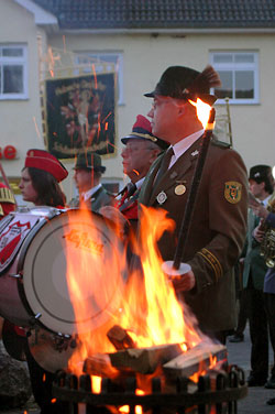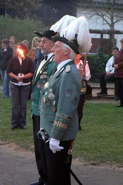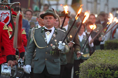 Unter der Leitung von Rudi Poensgen aus Marmagen und Ludwig Cremer aus Gemünd illuminierten die Schützen dabei den Vorplatz des Dahlemer Bürgerhauses mit Pechfackeln, während die Ehrengäste und Majestäten den Vorbeimarsch abnahmen.