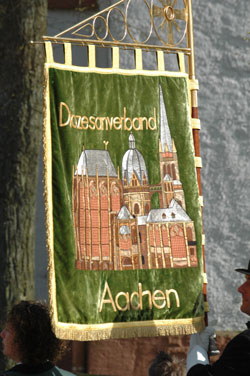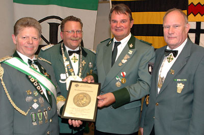 Nach einer a cappella Musikeinlage des Männersextetts der Kleinen Cantorei Dahlem übergaben Bundesschützenmeister Heinz-Gerd Dewies und Diözesanbundesmeister Kurt Bongard die Hochmeisterplakette der Bundes der Historischen Deutschen Schützenbruderschaften an den Schleidener Jubiläums-Bezirksverband und hefteten zudem ein symbolisches Fahnenbanner an die Bezirksstandarte.