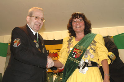 Bezirksschießmeister Jürgen Poensgen überreichte Bezirksbrudermeister Hermann-Josef Jakobs einen versiegelten Umschlag, der die Platzierungen der neun Kandidaten enthielt. Die Nachfolge von Lothar Krahe und Maria Krahe-Lauscher aus Wahlen trat dabei Agnes Renner aus Dahlem an, die mit 26 von 30 möglichen Ringen neue Bezirksschützenkönigin wurde.