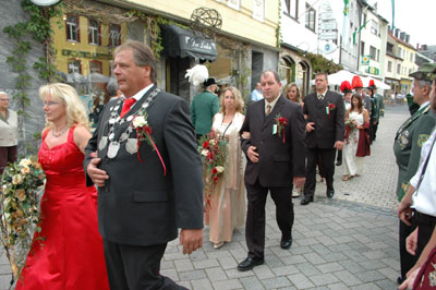 | Jungschützenprinz Andreas Mertens gefolgt von Bezirksschülerprinzessin Celina Wiedemeyer. Rechts die Majestäten der Bruderschaft aus Dedenborn aus den Reihen des Bezirksverbandes Monschau, die am Gottesdienst teilnahmen. |