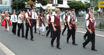 | Die Fahnenschwenker sorgten beim Platzkonzert an der "Alten Schule" für Unterhaltung, wo wenig später der Vorbeimarsch stattfand. |
