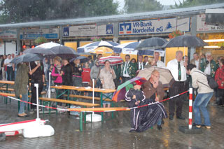 Oberst Rainer Schmitz meldete das angetretene Regiment und bedanke sich bei Ecki und Jessica für das schöne Königsjahr. Nach dem traditionellen Vorbeimarsch marschierten über 100 Schützen sowie die noch amtierenden Majestäten zum letzen Mal durch den Ort Gemünd, bevor die neuen Majestäten auf dem Schützenplatz ermittelt wurden.
