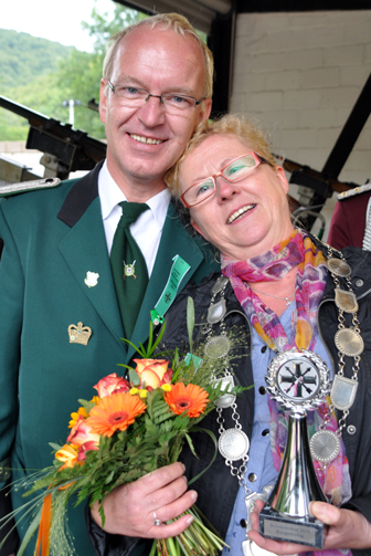 | Nach knapp 60 min war es für Sonja Schröders geschafft. Es wurden nicht weniger als 650 Schuss auf die Bürgerkönigsvogellisten gezeichnet. Benötigt wurden aber nur 73 Schuss. Man kann wirklich sagen, dass die Gemünder Bevölkerung im Kleinkaliberschießen auf den Bürgerkönigsvogel immer besser trifft. (Rückblick) Im Vorjahr haben wir auf den Rumpf noch 2 1/2 Stunden geschossen und benötigten insgesamt 156 Schuss. Jetzt ist es schon weit unter der Hälfte. Zahlreiche Aspiranten durften auf den Vogel anlegen, doch Sonja Schröders schaffte was noch keiner vorher geschafft hatte. Sie holte den Hattrick. Erst fetzte Sie mit dem 16.Schuss den Kopf von dem Vogel. Als dann Gaby Goch mit dem nächsten 21. Schuss den linken Flügel runter fegte, gab es für Sonja Schröders kein Halten mehr. Sie schmetterte den rechten Flügel vom hölzernen Federvieh mit dem nächsten 8. Schuss herunter, bis Sie dann schließlich nach knapp 60 Minuten und dem 73. Gesamtschuss dem Bürgerkönigsvogel den Rest gab. Sie erfüllte sich einen Traum. Sonja Schröders war seit Einführung des Bürgerkönigs 2005 immer dabei. Holte fast in jedem Jahr Flügel oder Kopf Pokale mit nach Haus. Nur in diesem Jahr sollte Ihr das nicht reichen. Sie schaffte es und ist somit die 7. Bürgerkönigin von Gemünd. Ab 16:00 Uhr bis in den frühen Abend zeigten neben dem Bürgerkönigsvogelschiessen die Jungs aus dem Pitztal Sigi und Gerd uns erneut das Sie Musik im Blut hatten...... |