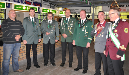 Zahlreiche Mitglieder der Bruderschaft wurden für 25 und 40 Jahre Mitgliedschaft ausgezeichnet. Bezirksbundesmeister Christoph Kammers nutzte den Frühschoppen um hier Markus Drehsen, Heinrich Quetsch, Matthias Quetsch, Markus Pütz und Peter Wergen aus der St. Peter-Kompanie sowie Norbert Müller aus der Antonius-Kompanie und den Hauptmann der Markus-Kompanie Alex Büsch für 25 jährige Mitgliedschaft auszuzeichnen. Eine Ehrung für 25 Jahre Mitgliedschaft musste er noch aus dem Jahre 2010 nachholen. Hierfür bat der 1. Vorsitzende Christoph Kammers Gustav Greindl aus der Rochus-Matthias-Kompanie zu sich nach vorne. Freudig konnte er Karl-Heinz Pohlen aus der IV. Kompanie, Manfred Müller und Werner Koller aus der Antonius-Kompanie sowie Manfred Müller aus St. Michael-Kompanie für 40 Jahre aktive Mitgliedschaft auszeichnen. Annemie Möres, Mathilde Freimark, Henriette van Lück, Margret Hickertz, Resi Golbach und Margret Kleevisch wurden ebenfalls für 40 Jahre Mitgliedschaft (teilweise inaktive) mit einem Blumenpräsent vom 1. Vorsitzenden Christoph Kammers bedacht. Im Anschluss daran beförderte er unseren noch amtierenden Schützenkönig Heinz-Willi Fedder zum Leutnant des Regiments, aufgrund seiner Dienste als König im vergangenen Schützenjahr. |