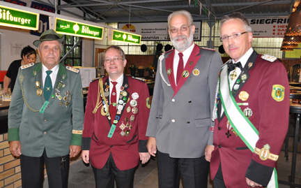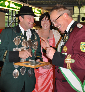 | Diese Gelegenheit nahm König Heinz-Willi Fedder zum Anlass um sich bei den Gemünder Schützen für die tolle und tatkräftige Unterstützung in seinem mit Frau Hannelore gemeinsamen Königsjahr zu bedanken. Es hätte Ihnen sehr viel Spaß gemacht und sie würden die Königsketten und die damit zusammenhängende Königswürden mit einem Tränenden Auge morgen wieder abgeben. Der 1. Vorsitzende Christoph Kammers bedankte sich auch bei König Heinz-Willi Fedder, der für das morgige Kaiserschießen eine neue Kaiserkette gestiftet hatte. Die Vorgängerkette hatte sich mit dem letzten amtierenden Kaiser Rainer Schmitz gefüllt, und bot keiner neuen Gravur und somit keinem neuen Kaiser mehr Platz. | |||||||||||||||||