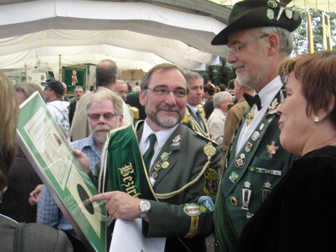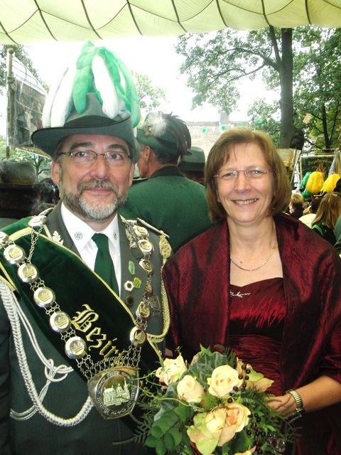 | Vom 16. bis 18. September 2011 besuchte eine Abordnung der Schützen aus Rohr-Lindweiler um das Bezirkskönigspaar Egon und Inge Peusens mit Bezirksbundesmeister Christoph Kammers das Bundesfest in Harsewinkel bei Gütersloh. Wie immer war es eine tolle Sache zusammen mit so vielen Schützen aus dem gesamten Gebiet des BHDS das größte Fest unseres Verbandes zu erleben. Der Höhepunkt für unseren Bezirkskönig war natürlich die Teilnahme am Bundeskönigsschießen mit 102 Teilnehmern. Leider reichte es für Egon nicht für einen der vorderen Plätze. Die Freude bei Schützen unseres Bezirksverbandes war aber bei der Bekanntgabe der Sieger trotzdem sehr groß, denn der Bezirkskönig unseres Nachbarbezirks Monschau, Rolf Drescher mit Gattin Elisabeth aus Lammersdorf, schaffte etwas Einmaliges seit es das Bundeskönigsschießen gibt. Mit 27 Ringen wurde er Diözesankönig der Diözese Aachen und holte diesen Titel erstmals nicht nur zum zweiten Mal hintereinander in den gleichen Bezirksverband, sondern sogar in die gleiche Bruderschaft. Damit tritt er die Nachfolge von Sebastian Heeren aus Lammersdorf an, den viele von seinen Besuchen beim Bezirksfest in Rohr-Lindweiler und in Gemünd kennen. Das Diözesankönigsfest wird am 06.05.2012 zusammen mit dem Simmerather Gemeindeschützenfest in Lammersdorf gefeiert und die Schützen des Bezirksverbandes Schleiden werden es sich sicher nicht nehmen lassen, auch im nächsten Jahr wieder unsere Lammersdorfer Freunde zu besuchen. Neuer Bundeskönig wurde Thomas Stahl aus Bassenheim (DV Trier) mit der optimalen Ringzahl von 30 Ringen. Im nächsten Jahr findet das Bundesfest vom 14. bis 16.09. in Hürth-Hermülheim quasi vor unserer Haustüre statt. Die Gelegenheit werden sicher noch viel mehr Schützen nutzen, um unseren neuen Bezirkskönig dann dorthin zu begleiten. |
