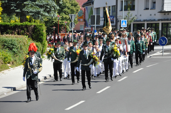 Das Wetter hätte besser nicht sein können, über 25° Grad und keine Wolke am Himmel. Gegen 14:30 Uhr formierte sich das Regiment am Hermann-Kattwinkel-Platz in Gemünd um mit den noch amtierenden Majestäten den letzten Festzug zu bestreiten. In gewohnter Manier führte Oberst Rainer Schmitz den Festzug zum Schützenplatz. Hier sollten am heutigen Montag in verschiedenen Wettkämpfen die Majestäten neu ermittelt werden.