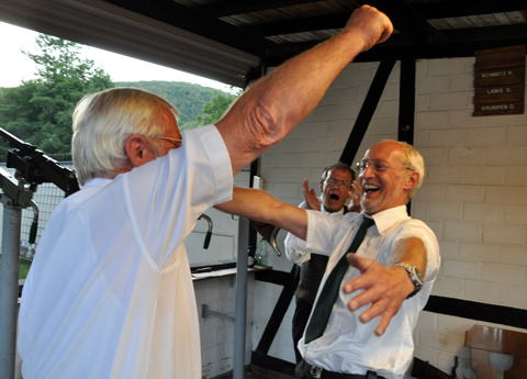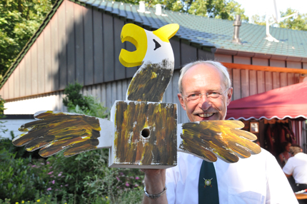 Dieser war kein Anderer als unser neuer Platzwart und Schützenbruder Willi Geschwind, ebenfalls aus der Jubiläums-Kompanie. Willi fegte mit dem 48. Schuss!!! den Vogel von der Stange. (Im letzten Jahr hielt der Vogel mit Flügel, Kopf und Rumpf 49. Schuss stand)