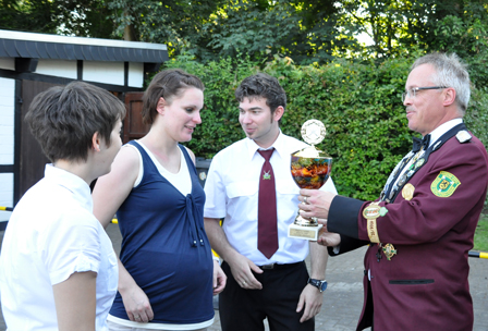 Nachdem die Flügel vom Rumpf getrennt waren verkündete der 1. Vorsitzende und Bezirksbundesmeister Christoph Kammers die Ergebnisse des Damenpokalwettkampfes und des Jungschützenprinzenschießens. Hier konnte Florian Schmitz aus der St. Peter-Kompanie die Würde des Jungschützenprinzen erringen und sicherte somit die erste Majestätenkette für die St. Peter Kompanie, die in diesem Jahr ihr 50-jähriges Jubiläum feiert. Florian ist 22 Jahre alt und wird zusammen mit seiner Prinzessin Melissa Kühl (19 Jahre) ein Jahr lang die Jugend im Regiment anführen.