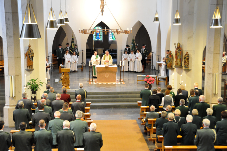 Pfarrer i.R. Rolf Knips, Präses der Bruderschaft, begann die Heilige Messe zum Auftakt des diesjährigen Schützenfestes mit den Worten, "mach mal Pause". Die Schützen und die Gemeinde sollten mal vom Alltag Pause machen und über das Leben nachdenken. Präses Knips zelebrierte zusammen mit Diakon Klaus Hövel und mit Unterstützung der Schützenschwester Hilde Wergen und des Schützenbruder Horst Schür die Heilige Messe. Im Verlauf der Messe gedachte Präses Knips der Gefallenen der Weltkriege und Bezirksbundesmeister Christoph Kammers sowie Kaiser Wido Schmidt legten einen Kranz zum Gedenken in der Kirche nieder. |