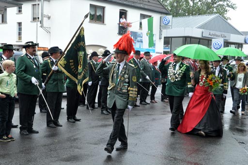 Nachdem Oberst Rainer Schmitz das Regiment nach der traditionellen letzten Schnapsrunde vom König Thorsten Harth am Herman-Kattwinkel-Platz formiert hatte, marschierten die Schützen zu den Klängen vom Tambourcorps Herhahn-Morsbach zum Schützenplatz.