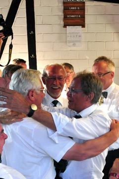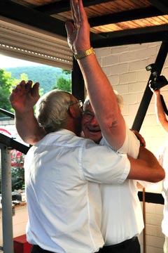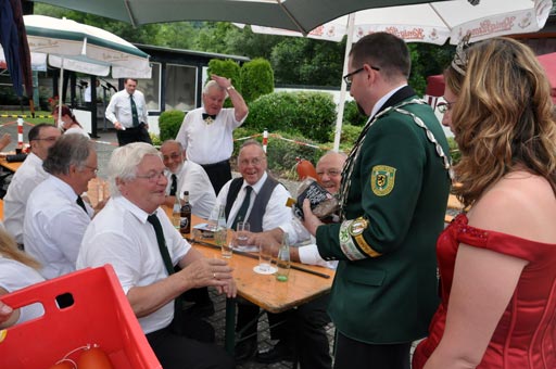 Alles andere als planmäßig hatte das diesjährige Schießen begonnen, denn schon nach wenigen Schüssen auf das hölzerne Federvieh hatte sich der von Matthias Quetsch geleimte Klotz aus Fichtenholz von der Haltestange gelöst und hing daraufhin kopfüber von der Stange. Dieses Malheur wurde aber umgehend behoben und das Schießen fortgesetzt, bei dem Raimund Schröders mit dem 21. Schuss den Kopf des Königsvogels traf und sich damit einen Orden sicherte. Nur einen Schuss benötigte Willi Geschwind für den rechten Flügel, dessen Reste als Splitter aus dem Hochstand rieselten. Zu Schade nur, dass dieser Teil des Königsvogels noch gar nicht zum Abschuss frei gegeben war, denn zunächst galt es den linken Flügel zu treffen. Doch die Schießleiter hatten ein Nachsehen und legten kurzerhand eine neue Schussfolge fest. Max Harth bewies dann Treffsicherheit mit dem neunten Schuss auf den linken Flügel.