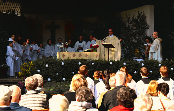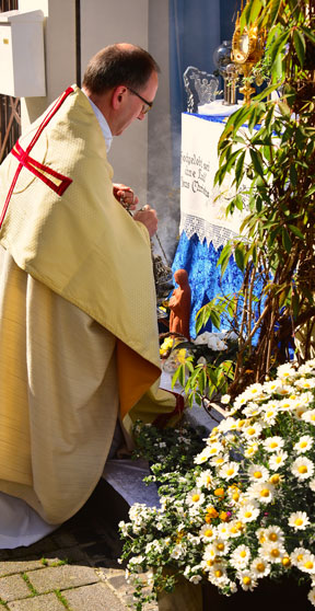 | „Alle Jahre wieder“ passt auch bei der Fronleichnamsprozession. Im Turnus von 3 Jahren wechseln sich die Pfarrgemeinden im Schleidener Tal mit der Prozession ab. In diesem Jahr zogen die Gläubigen, angeführt von der St. Sebastianusschützen-bruderschaft und den Gemeinden aus Olef, Schleiden, Oberhausen und Gemünd wieder durch die Gemünder Innenstadt. Zuvor trafen sich die Pfarrgemeinden im Kurpark in Gemünd, wo Pfarrer Philipp Cuck und Weihbischof Karl Borsch mit Unterstützung des Gemünder Kirchenchors unter der Leitung von Heinz Ströder die Hl. Messe zelebrierte. Im Anschluss an den Gottesdienst zogen die Gläubigen mit den Kommunionskinder , Messdienern und Anwesenden Schützen in einer eindrucksvollen Prozession zur St. Nikolauskirche. Nach alter Tradition trugen die Schützen den „Himmel“ und begleiteten die Monstranz. Hier dankte Pfarrer Cuck den Gemeinden für die sehr große Beteiligung. Eine so lange Prozession habe er lange nicht mehr gesehen. Vom Kurpark zogen die Gläubigen mit Unterstützung des Musikvereins aus Waldorf wieder in die Kirche um den Schlusssegen zu erhalten. Im nächsten Jahr findet die Prozession dann in Schleiden statt, im darauffolgenden Jahr in Olef und 2019 ist wieder Gemünd an der Reihe. |