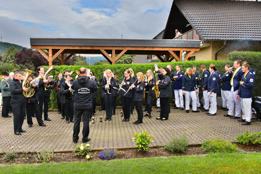 Beim König spielte der mit angetretene Musikverein Eifelklänge und das Tambourkorps Eifelgold Herhahn-Morsbach zu Ehren des Königspaares ein Platzkonzert bevor es zum Abmarsch nach Gemünd in die St. Nikolauskirche zur hl. Messe ging.