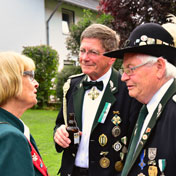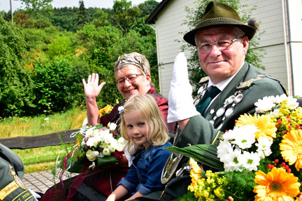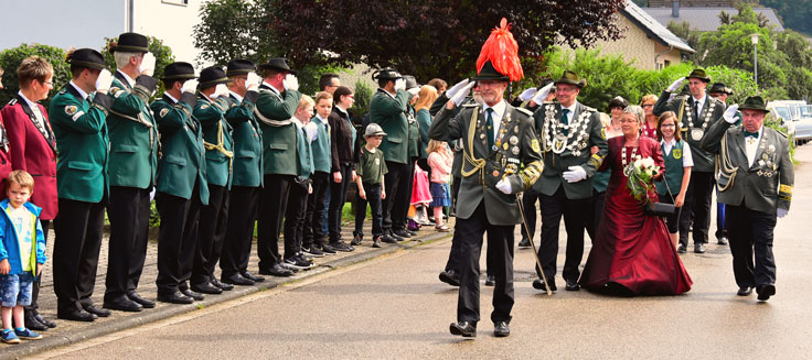| Da es heißt: "Der König macht das Wetter" erschien pünktlich um 17 Uhr zum Vorbeimarsch der Majestäten die Sonne und der Festzug startete im trockenen Richtung Gemünd. |