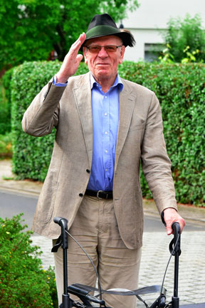 | Eines der ältesten Vereinsmitglieder, Karl-Hans Zeihen aus der 5 Kompanie, nahm den Festzug vom Straßenrand ab und grüßte die Majestäten wie sich das gehörte. |