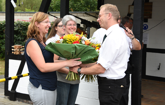| Für zwei Damen gab es noch eine schöne Überraschung. Ditmar Krumpen rief die beiden Ehefrauen der Jungschützenmeister des Regiments zu sich nach vorne zum Hochstand. Die beiden Damen, Silke und Marion, helfen den Jungschützenmeistern Thorsten und Dirk bei der Betreuung der Jugend im Verein. Sind immer da wenn es was zum vorbereiten gibt. Sie gehören schon fest zur Jugendabteilung dazu, wobei Marion nicht einmal Mitglied im Verein ist. Hierfür bedankte sich der 1. Vorsitzende Ditmar Krumpen mit zwei großen Blumensträüßen, die durch den stv. Jungschützenmeister Dirk Lenzen und Jungschützin Laura übergeben wurden. |
