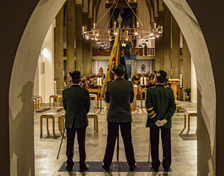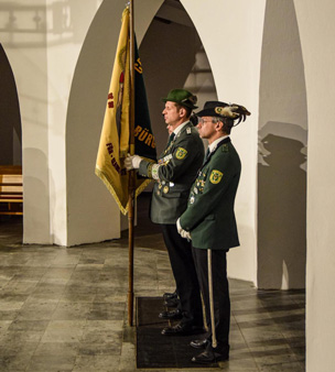 Weihbischof Karl Borsch erinnerte an seine persönlichen Eindrücke bei einem Besuch wenige Tage nach der Flut; das Leid der Menschen, die unvorstellbaren Zerstörungen, die großartige Hilfsbereitschaft. Das Kirchenschiff wurde von den 2,20 m hohen Fluten verwüstet. Sein großer Dank und der von Pfarrer Cuck ging an alle an der Wiederherstellung beteiligten Menschen und Unternehmen - insbesondere den stv. Vorsitzenden des Kirchenvorstandes, Karl-Wilhelm Jansen. Auch das Bistum Aachen hat zur Sanierung jede notwendige Unterstützung geleistet. Unsere Schützenbruderschaft nahm ebenfalls am Gottesdienst teil und erstmals hinter der erst vor wenigen Tagen fertiggestellten neuen Fahne. Auch für uns ein weiteres Zeichen des Neuanfangs. Die Fahnenweihe findet voraussichtlich im Mai statt. |